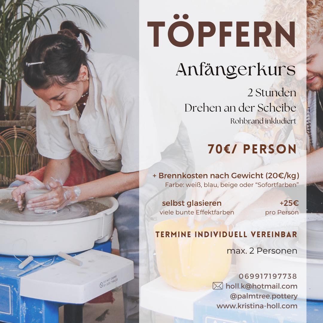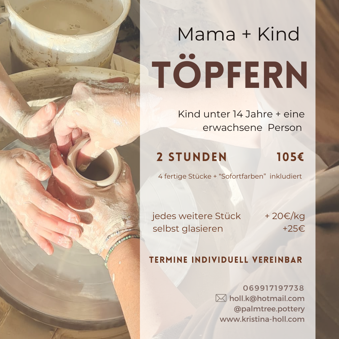 Lerne in 2 Stunden die Töpferscheibe kennen. Es werden ca 2-4 kleine Gefäße entstehen (Schälchen/Vasen/Becher/...). Mit viel Hilfe können auch größere Dinge gefertigt werden! Rohbrand inkludiert. Maximal 2 Personen